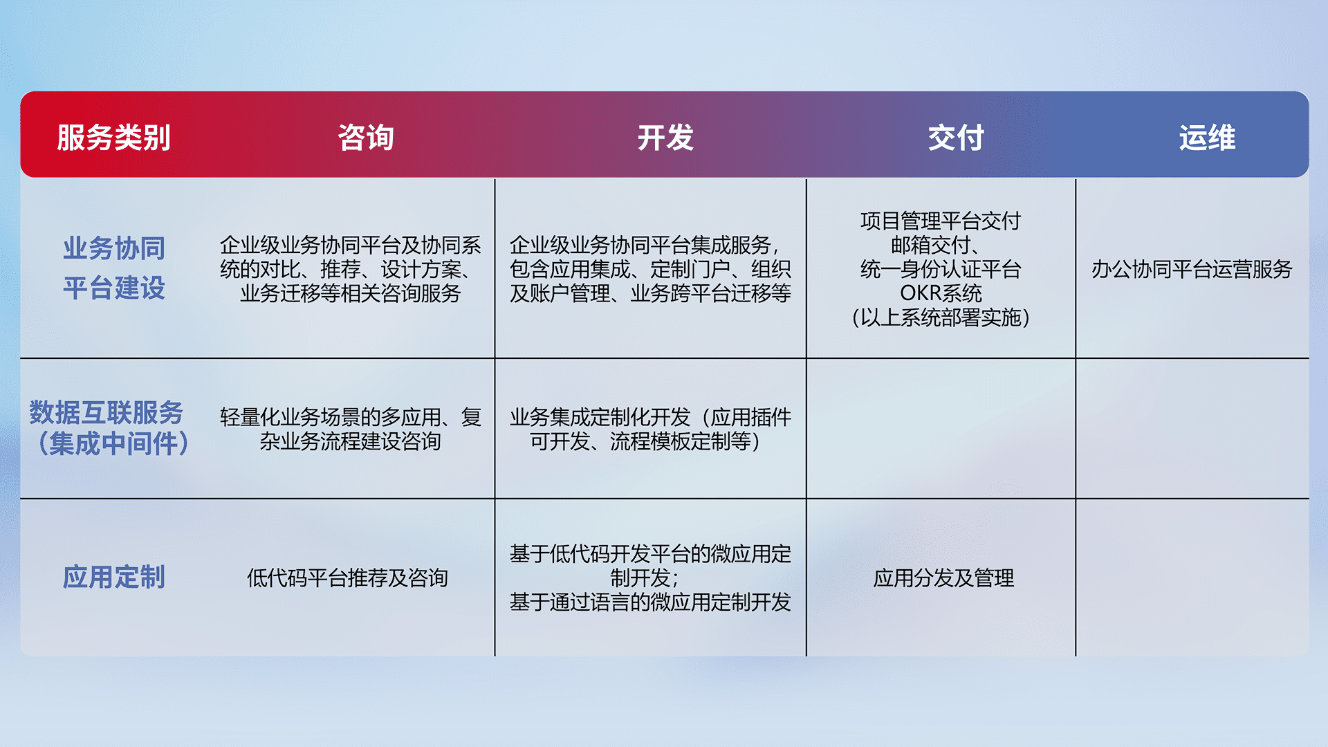 针对钉钉、、企微、、、IDaas等平台级产品提供产品的规划、、、、方案、、交付、、定制化开发等服务,,,实现如统一协同办公、、、智能客户服务、、混合会议管理、、智能数据查询、、等业务场景,,,实现数字化转型。。